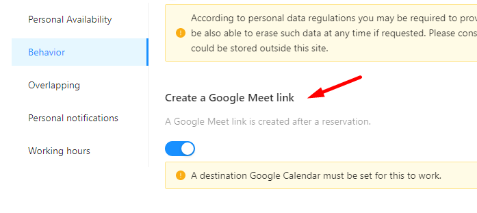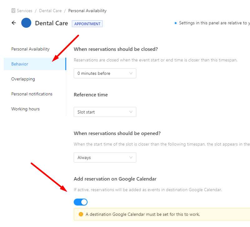 Then go to the **Behavior** tab and activate the **`Add reservation on Google Calendar`** setting if not already active: